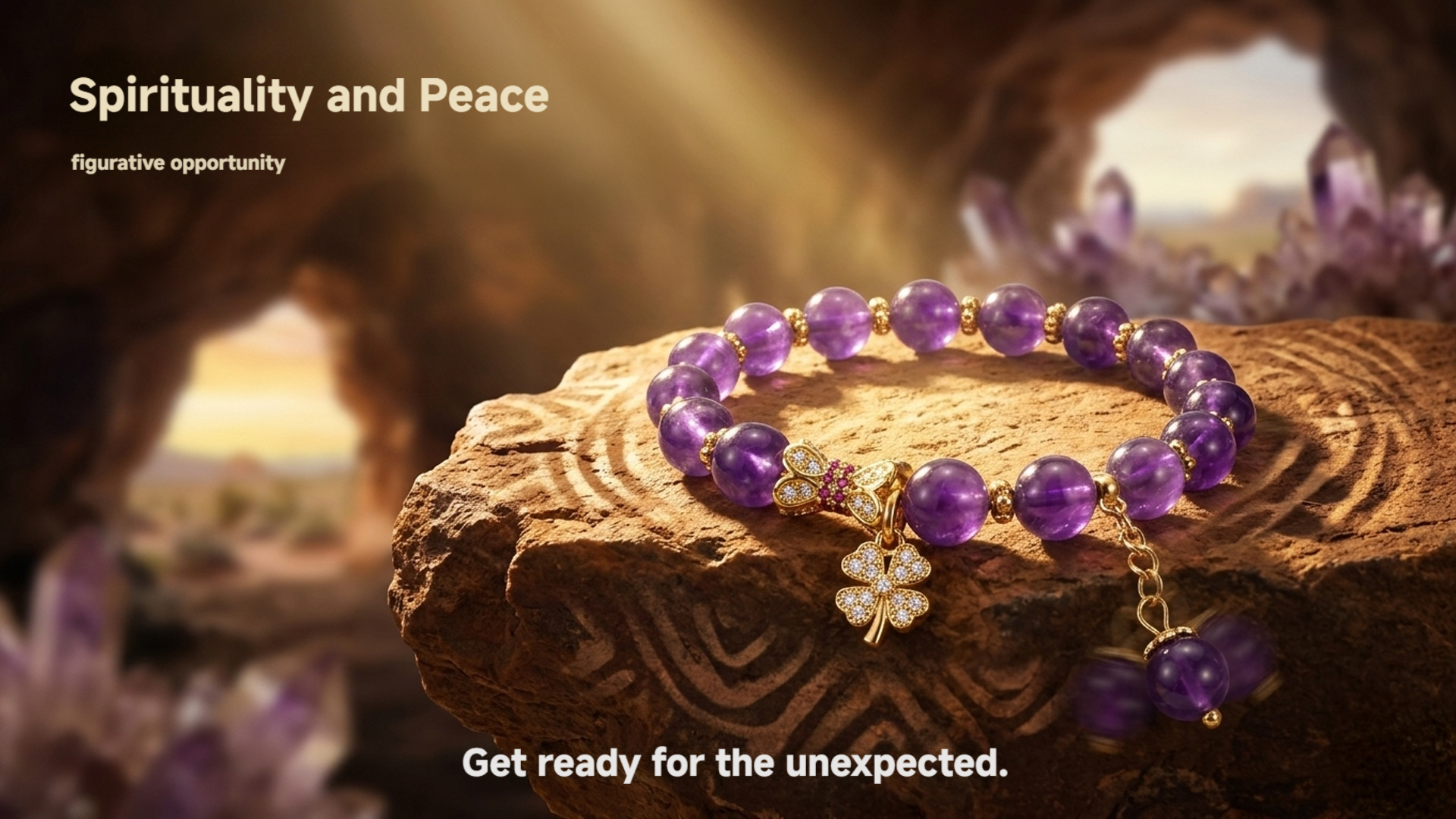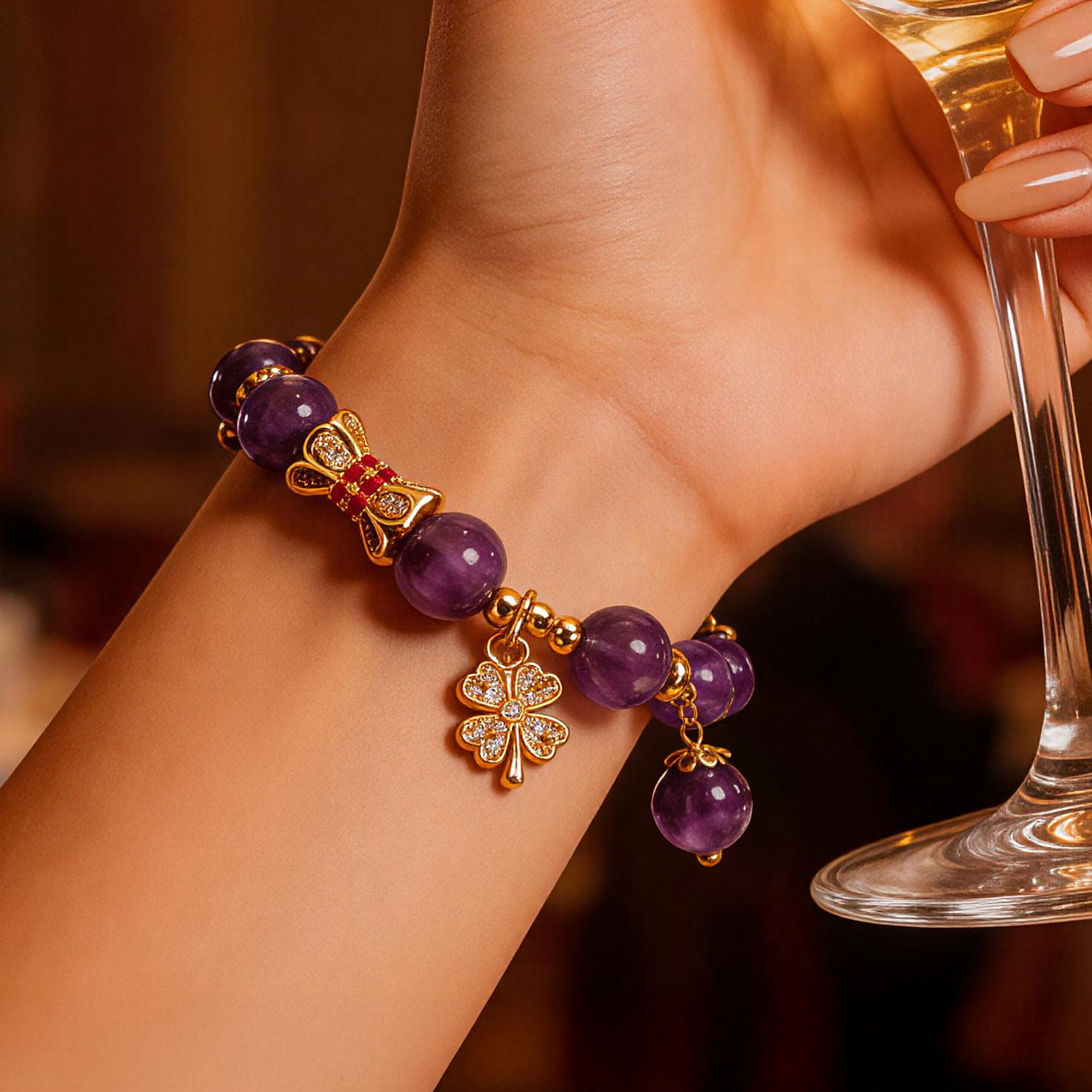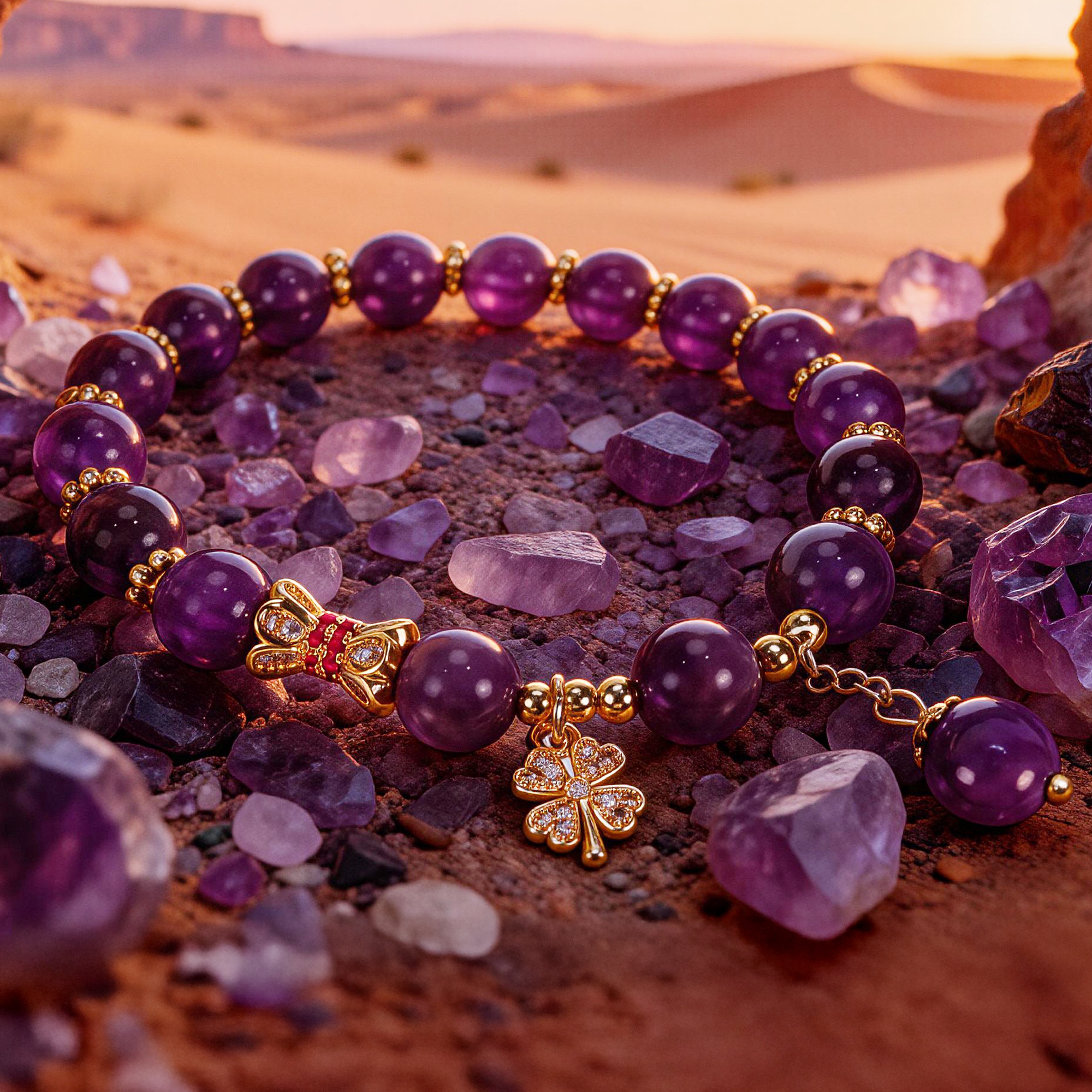 Story:This bracelet was awakened by sunlight in the amethyst caves of Arizona.Every bead holds the boundless energy of desert sunrises, while the four-leaf clover carries the ancient wisdom of the indigenous people — “Luck flows with your pulse”.