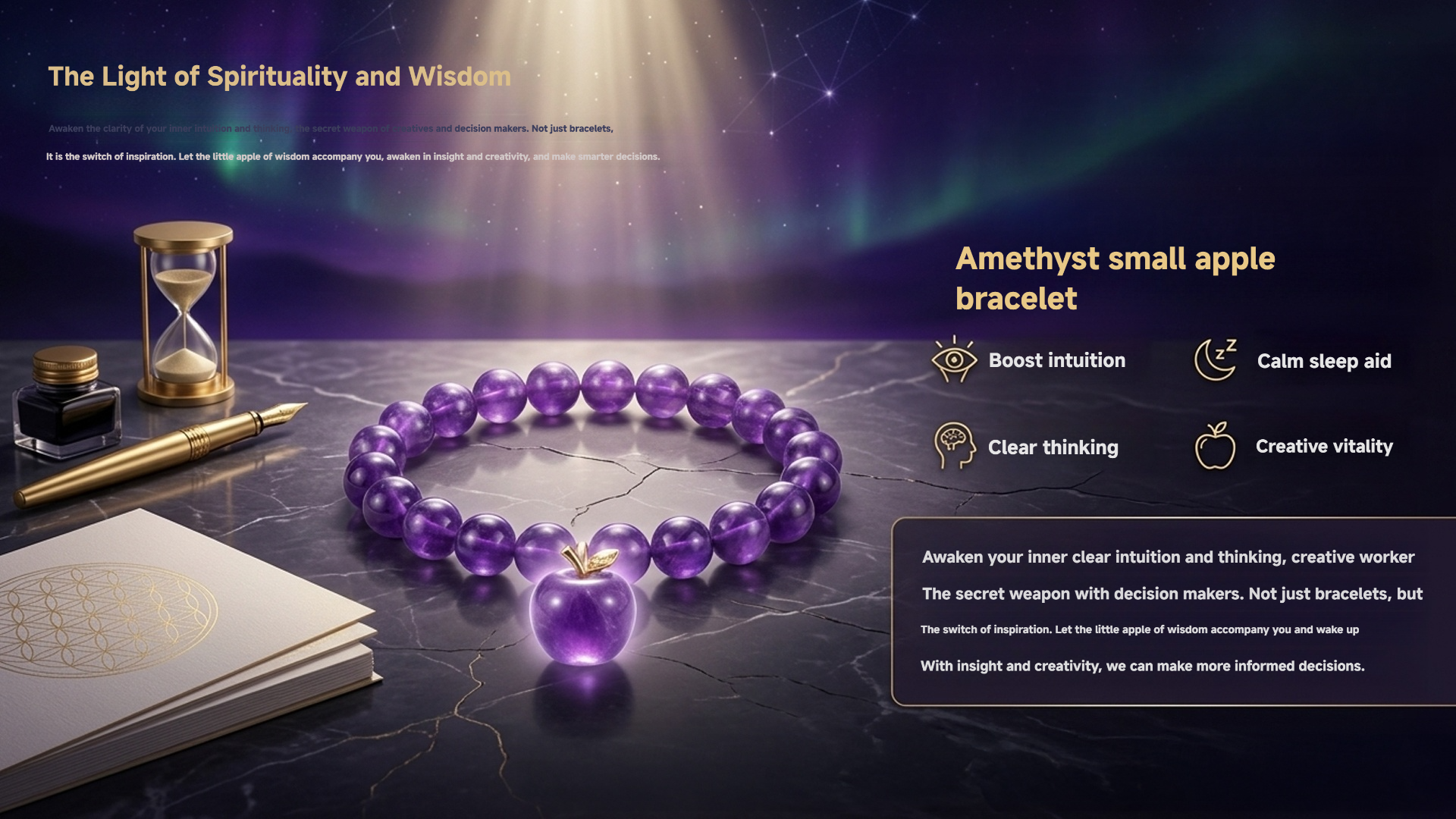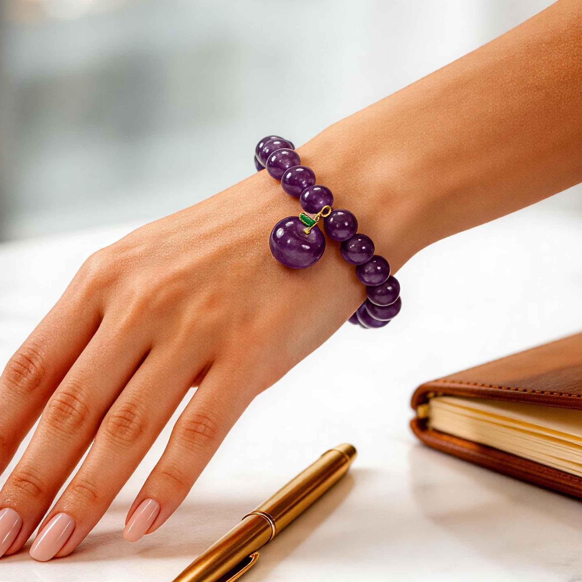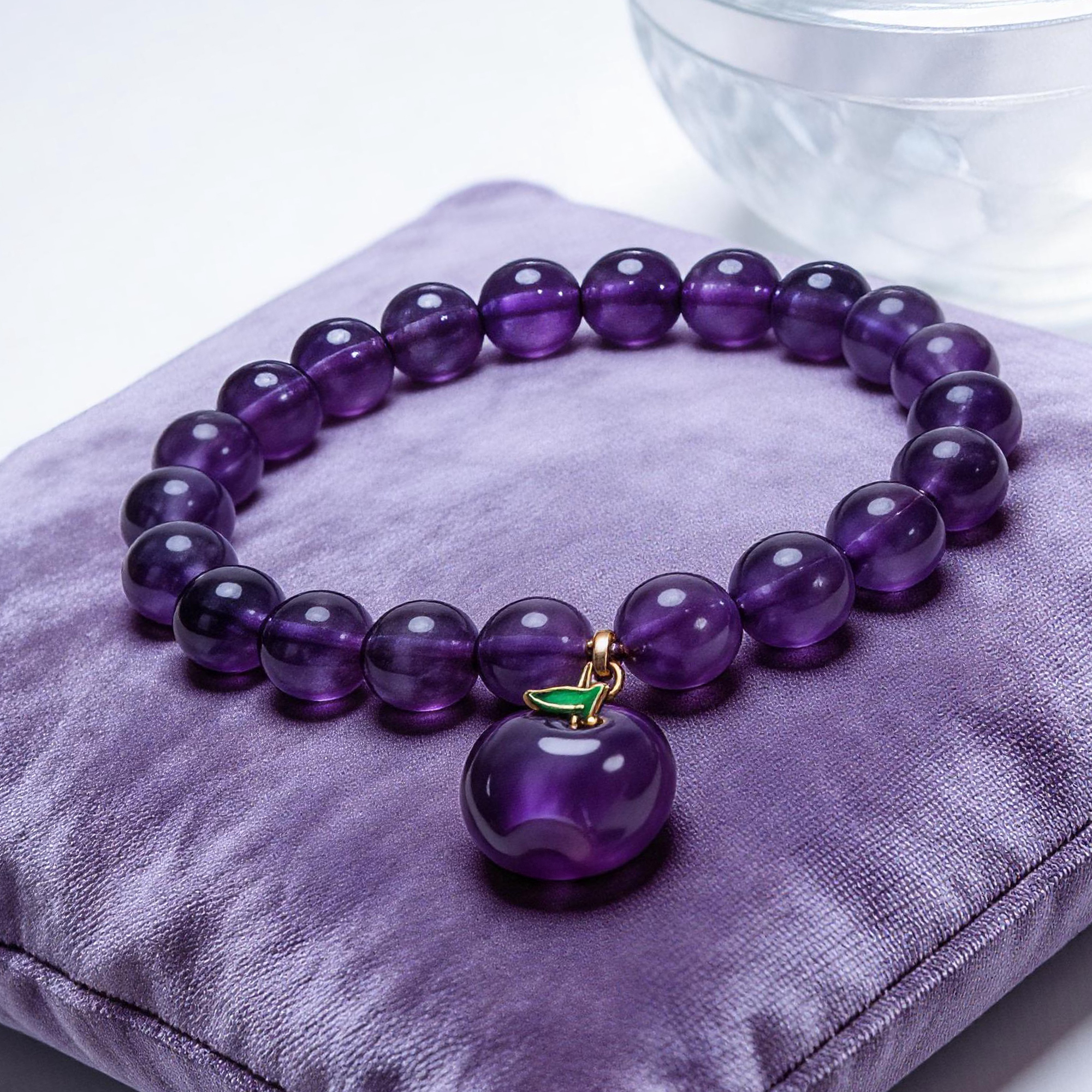 Story:This is more than just a bracelet — it is your switch for inspiration.Natural amethyst is known as the “Stone of Wisdom”. Legend says it awakens clear thinking and intuition. Paired with a small apple that symbolizes vitality and health, it becomes the secret weapon for every creative professional and decision-maker.