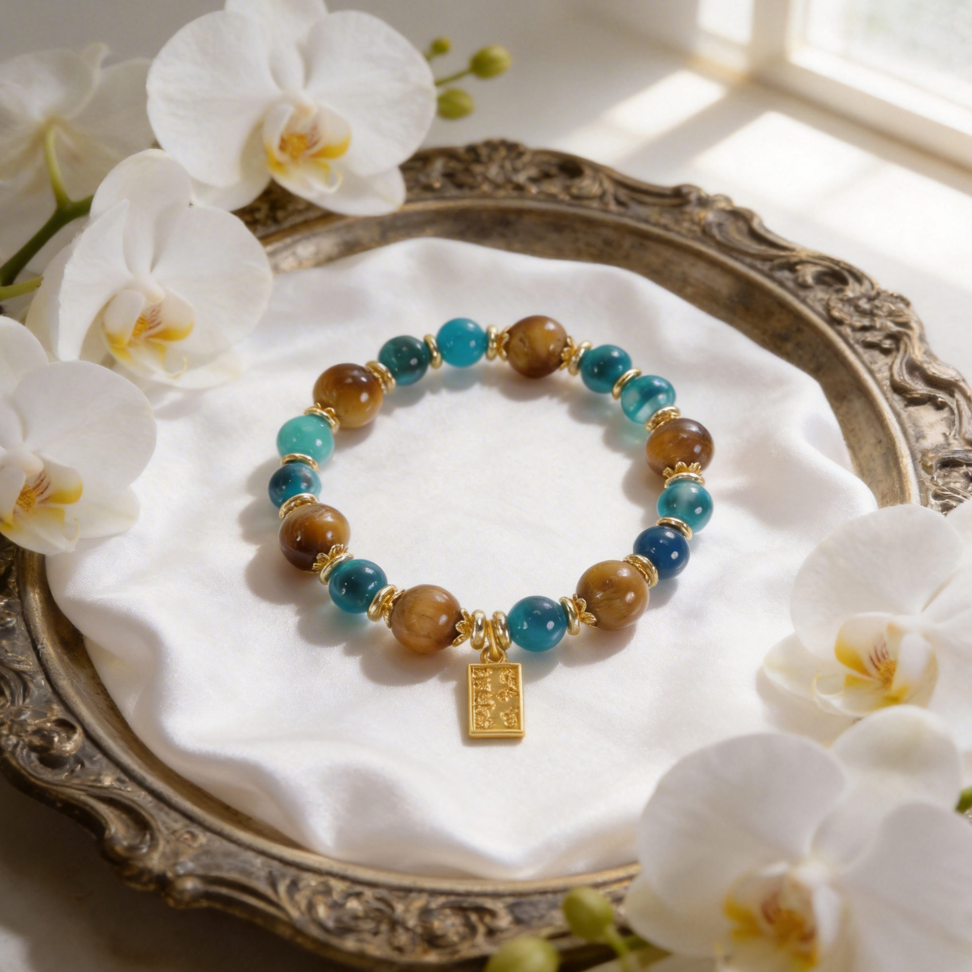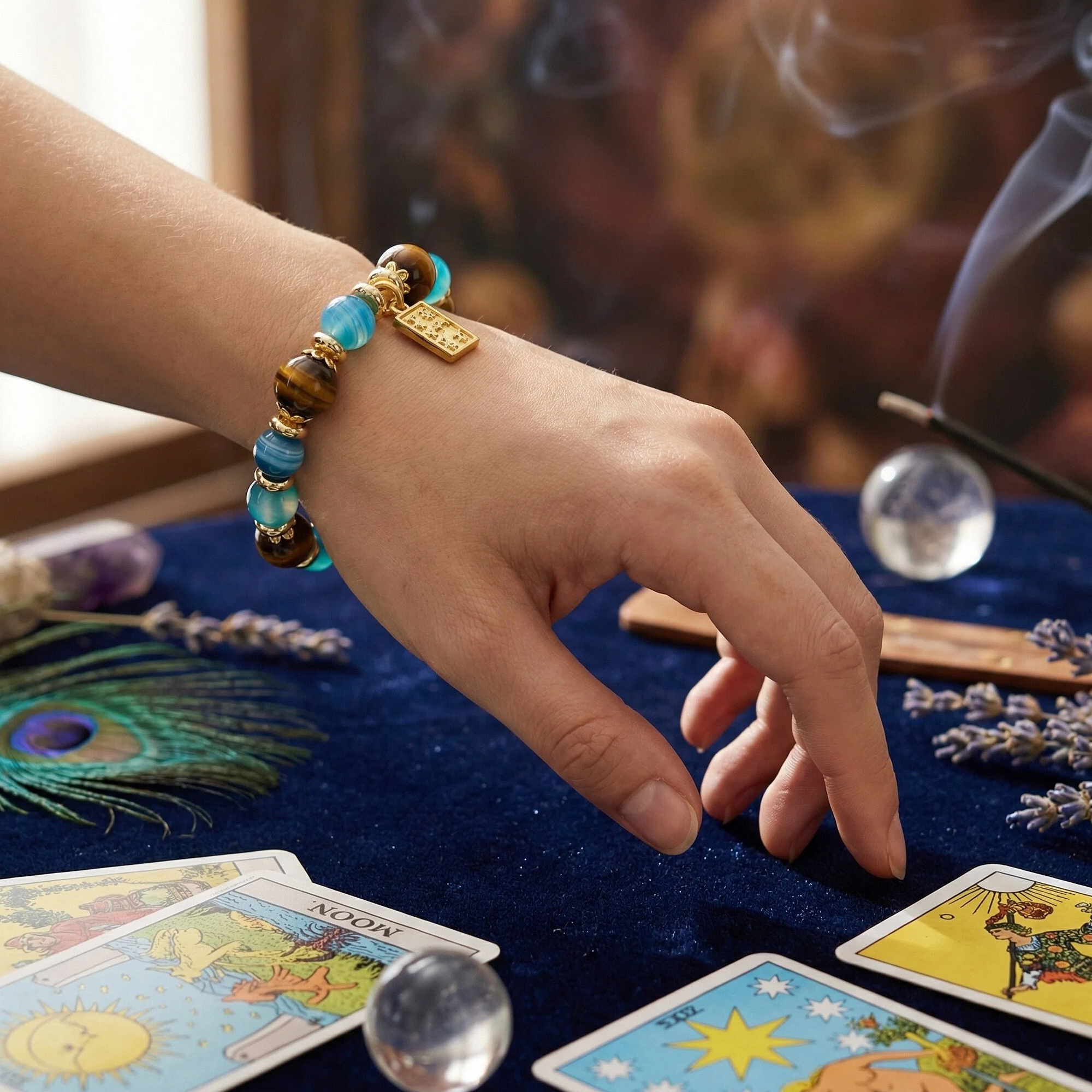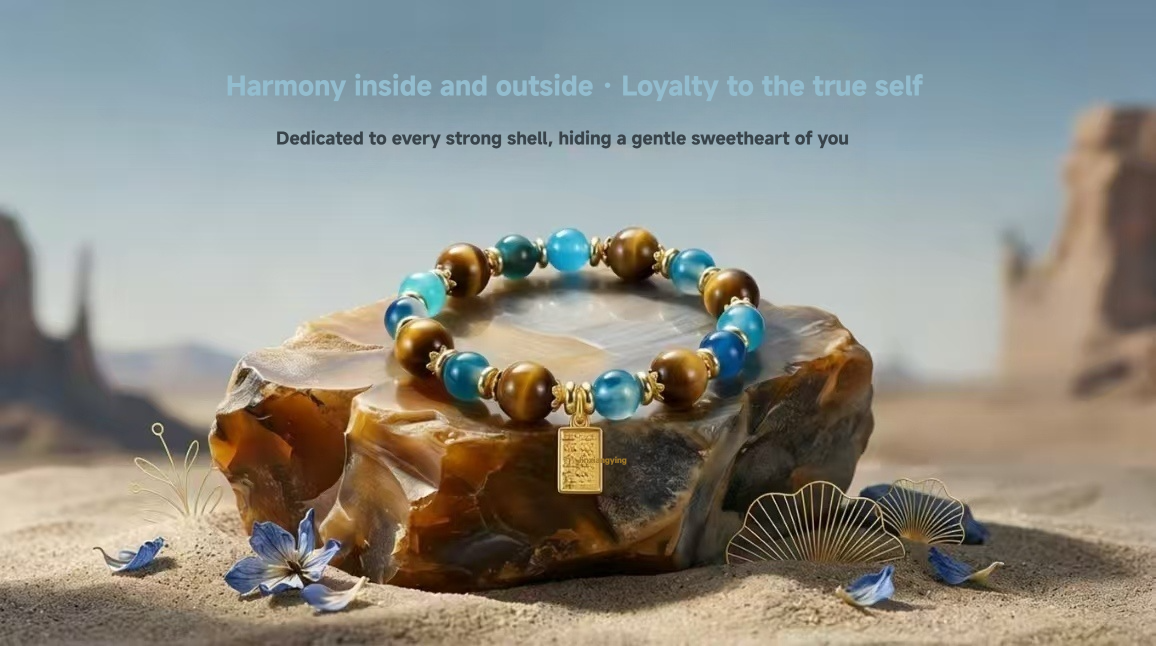 Tiger’s Eye: Symbol of courage and strength, guardian of focus and clarity.Blue Candy Heart Agate: Inner purity, emotional healing, one-of-a-kind.