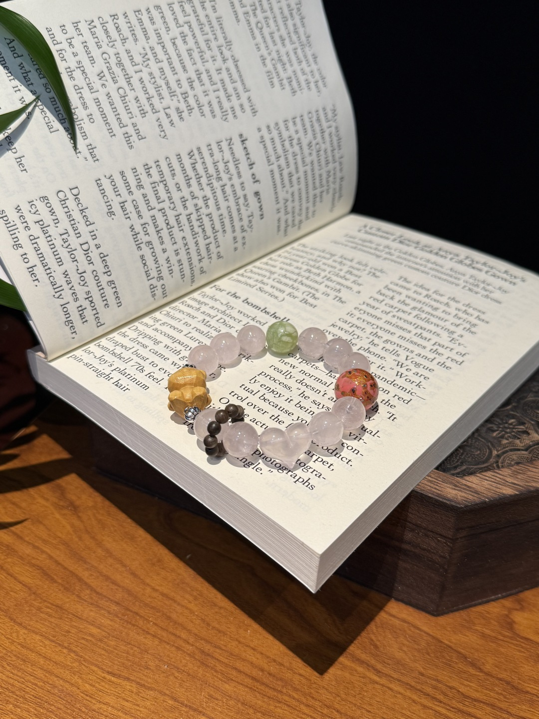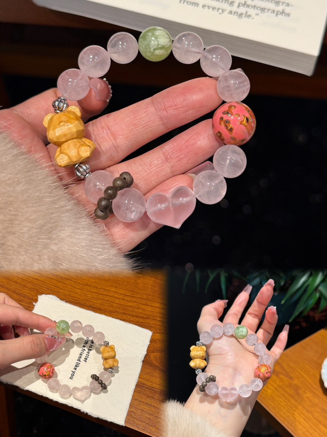 Today’s good luck comes from it ✌.Rose Quartz paired with a pink heart-shaped peach butt charm, super cute.I’m instantly healed by this “Bear Turns Troubles into Blessings” design at first sight ❤️Materials: Rose Quartz / Green Grape Milky Jade / Lacquer Craft
