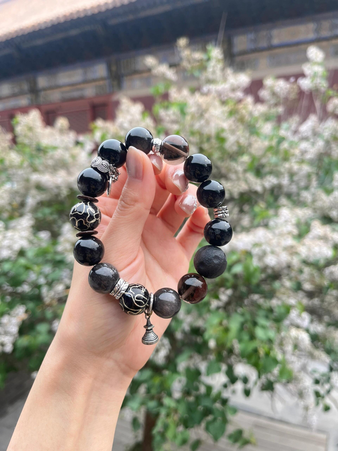 Silver Obsidian with Cloisonné, Size: 14mm, Men’s Bracelet