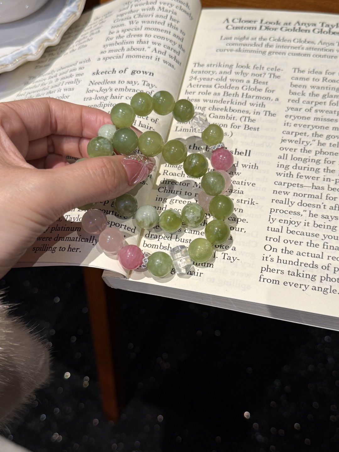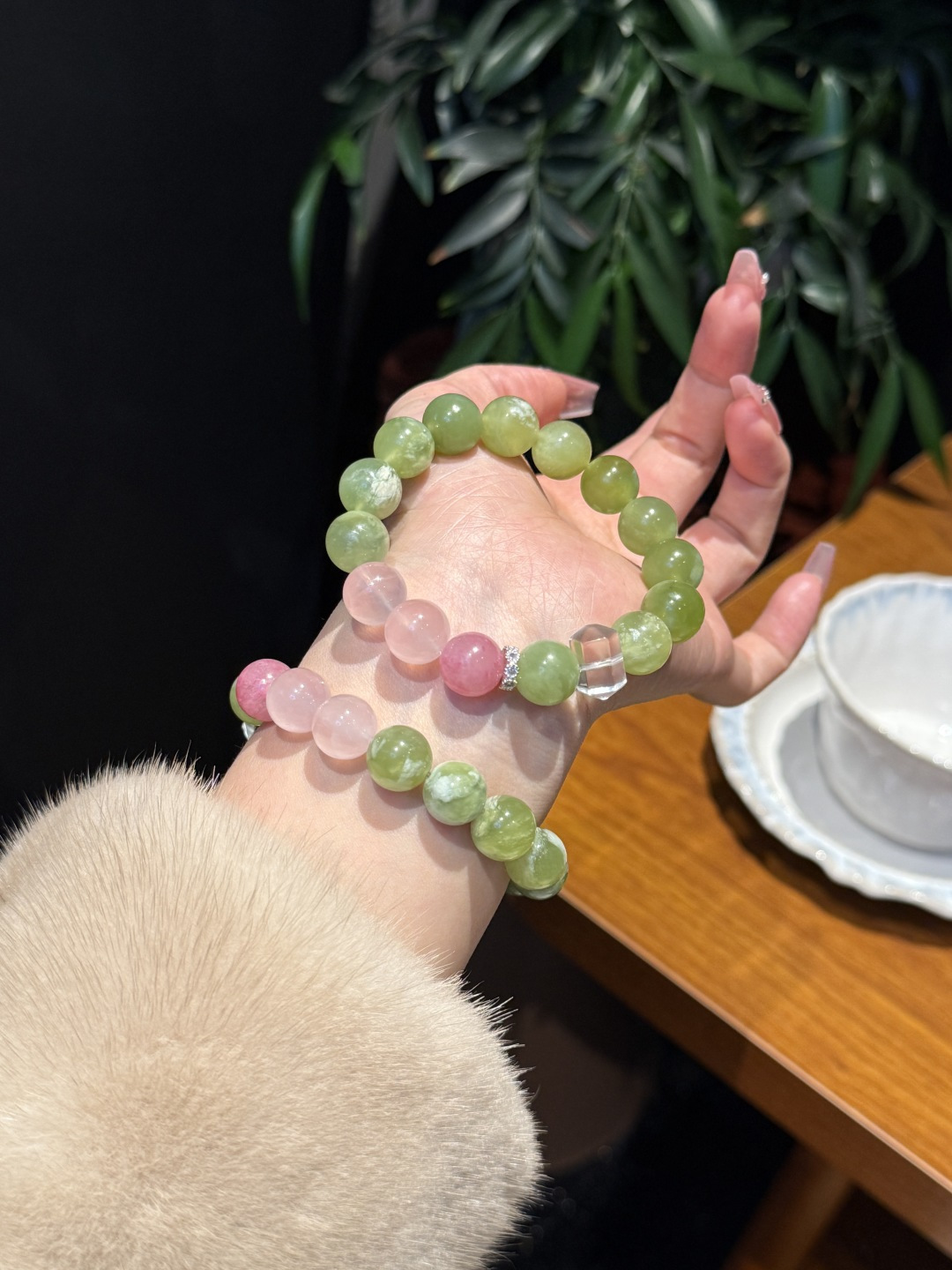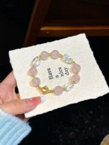 Who can resist this amazing bracelet with rose quartz, cherry blossom rain rose quartz and green grape milk cap jade?