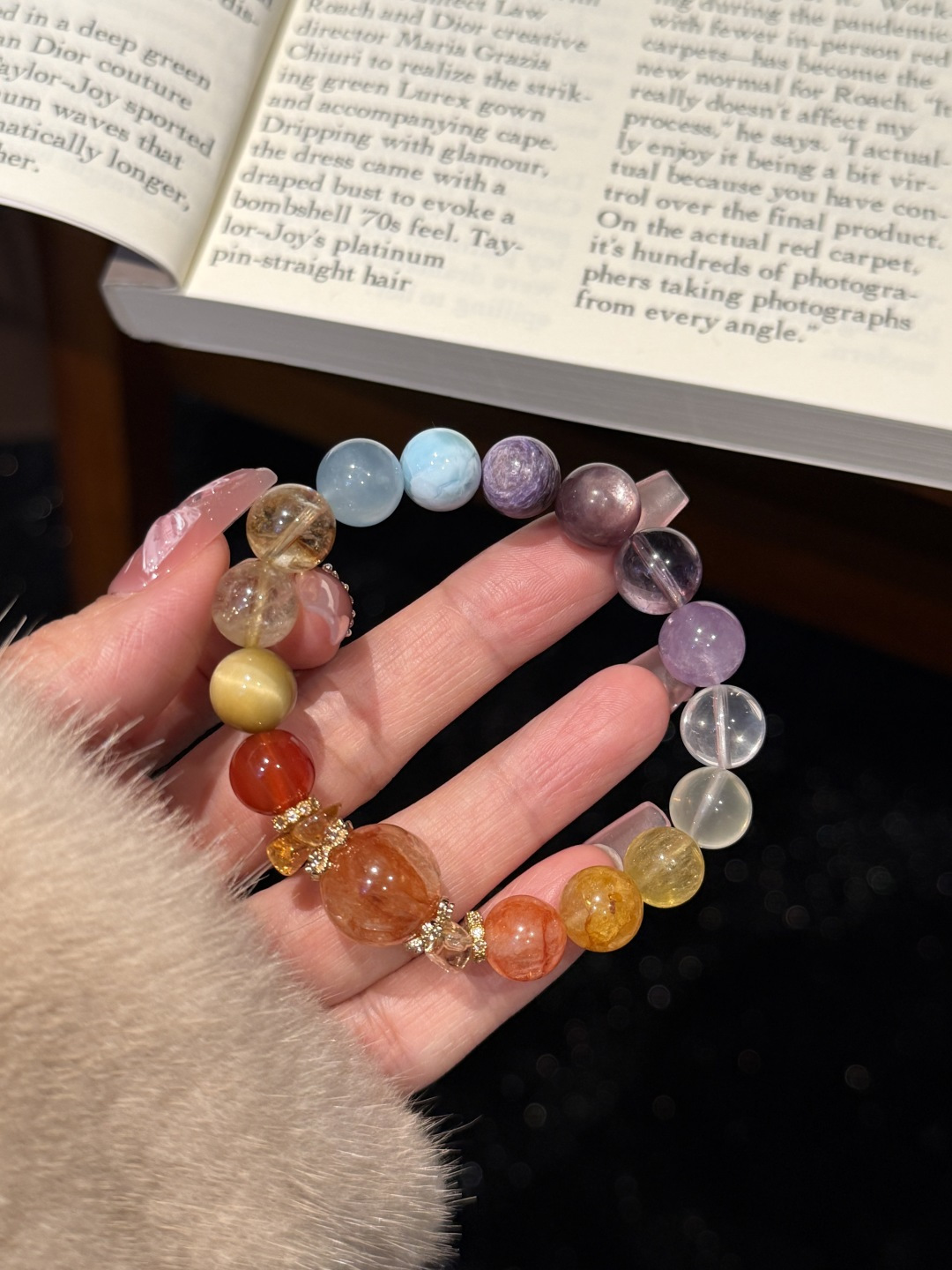 Red Phantom Quartz, Yellow Phantom Quartz, Yellow Fluorite, Citrine, Clear Quartz, Lavender Amethyst, Amethyst, Purple Lepidolite, Charoite, Larimar, Aquamarine, Yellow Tourmaline, Golden Rutilated Quartz, Tiger’s Eye, Agate