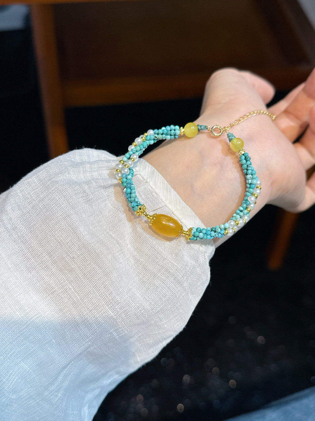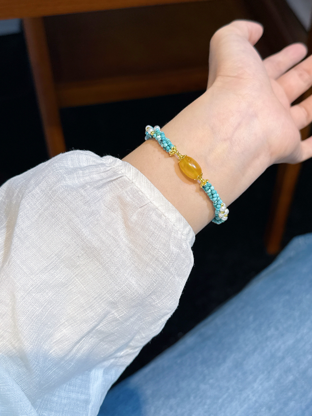 This turquoise micro-bead bracelet, paired with natural beeswax, brightens your skin tone and looks great with any outfit❗️
