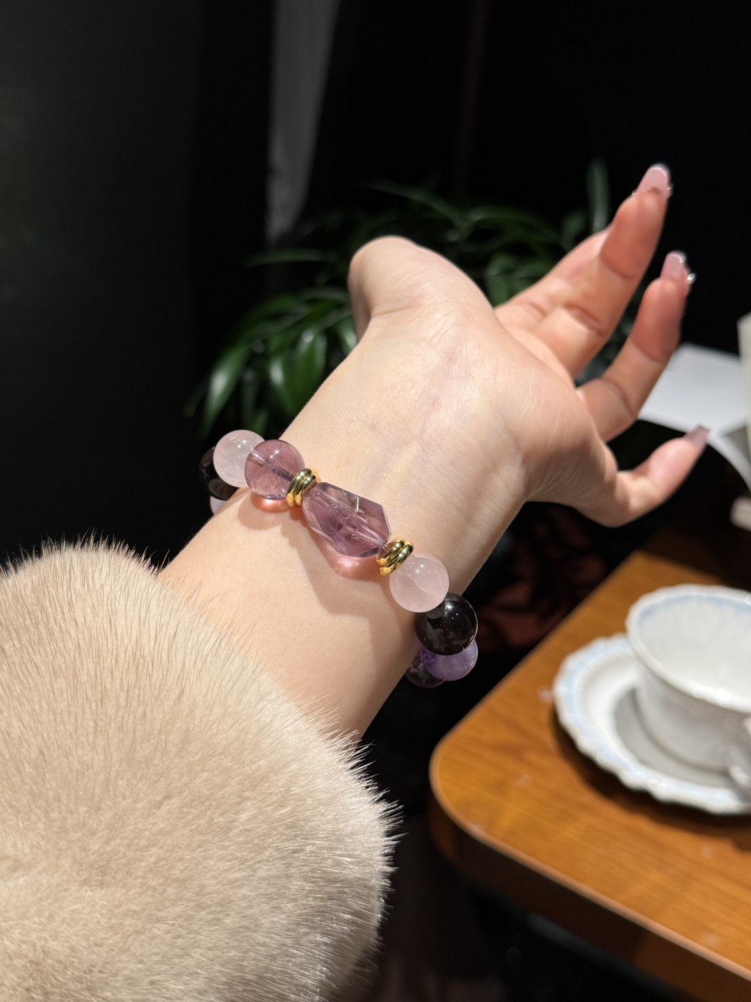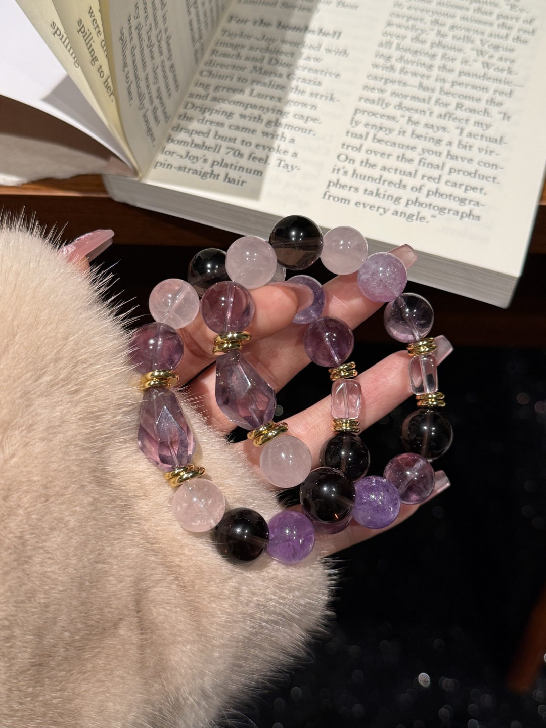For girls looking to enhance their luck, amethyst is the metaphysical stone to wear—anyone who puts it on looks elegant. The cool tone of amethyst paired with the calmness of smoky quartz, and the clarity of translucent crystals balances out any heaviness. Worn on the wrist, it exudes exceptional grace.