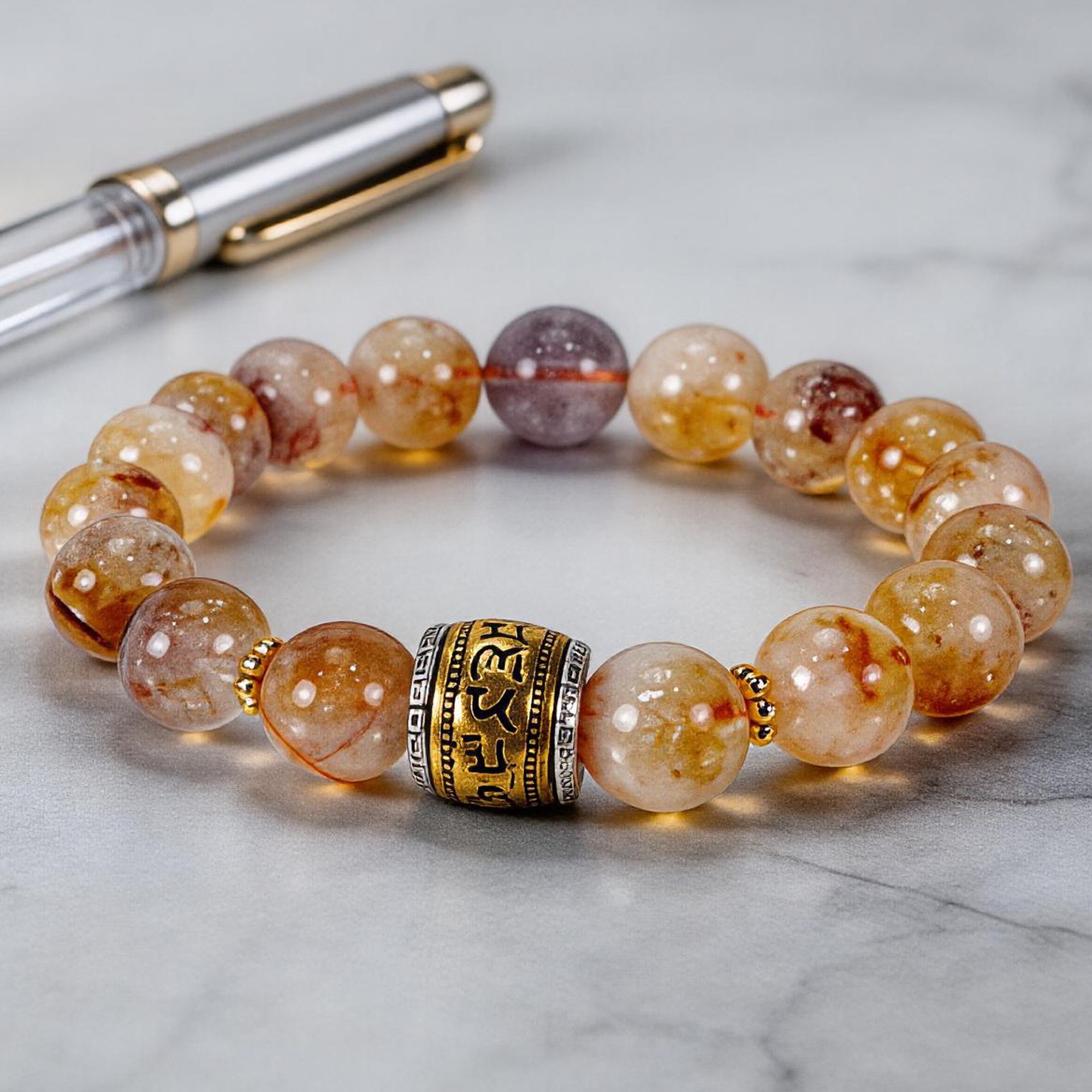 Yellow Rutilated Quartz & Purple Phantom Six Syllable Mantra Bracelet Approximately 10 mm