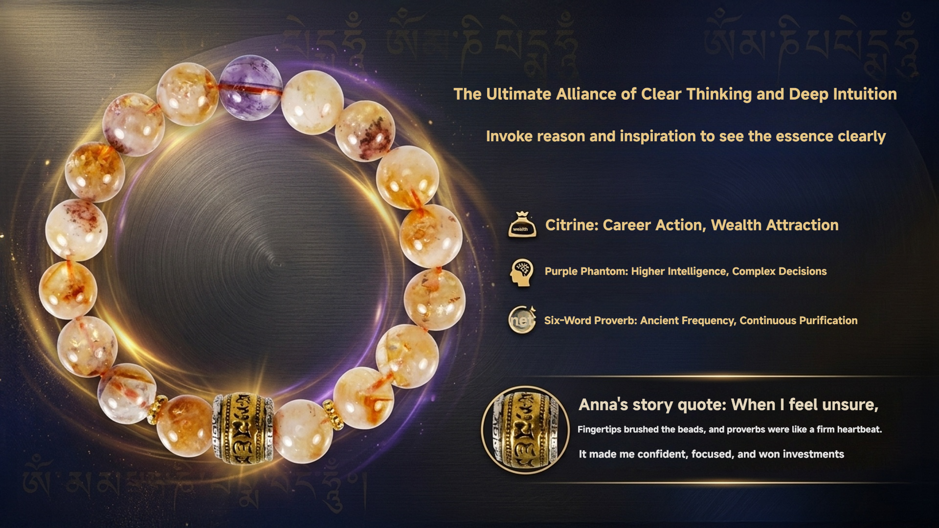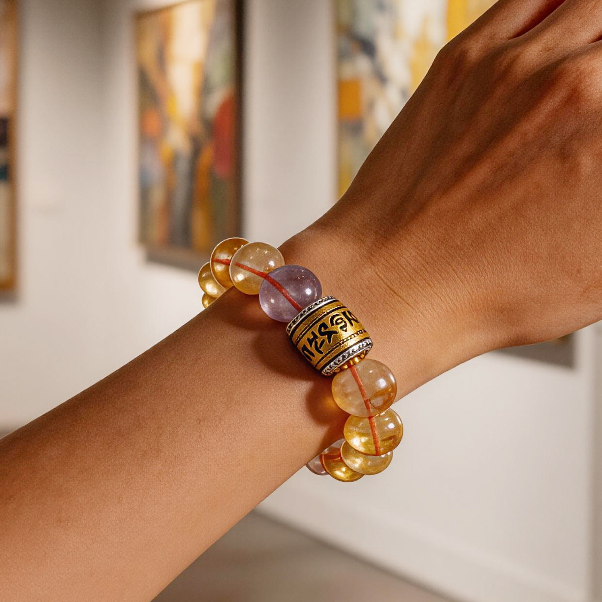 Story:This bracelet is the ultimate union of your clear thinking and deep intuition.Natural citrine stimulates your initiative and creativity while attracting opportunities; Purple Phantom connects you to higher wisdom, helping you see the essence in complex decisions.The engraved Six-Syllable Mantra carries an ancient frequency of constant purification.